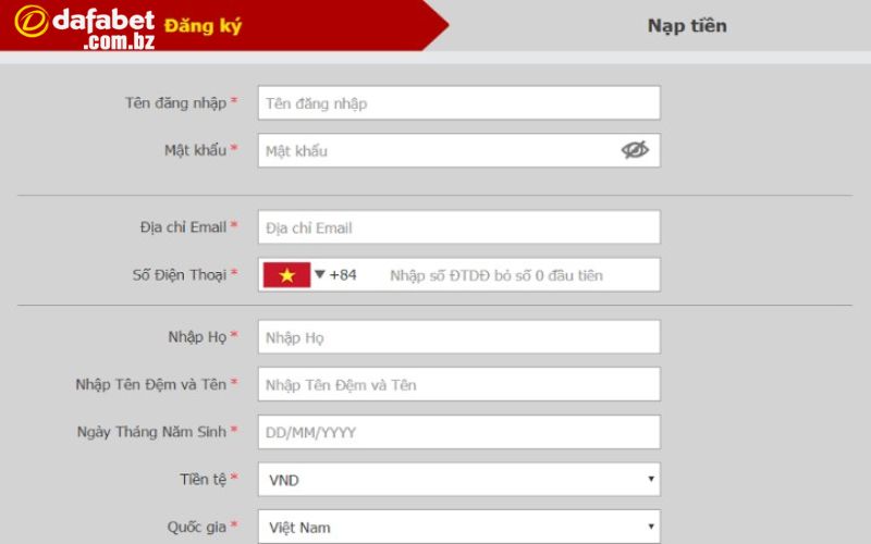 Sau khi bạn anh em đã chuẩn bị xong những yêu cầu ở trên, người chơi chỉ cần truy cập vào trang chủ của nhà cái và chọn đến nút “Đăng ký dafabet” tại giao diện. Sau đó bạn chỉ cần làm theo các bước hướng dẫn sau đây:
