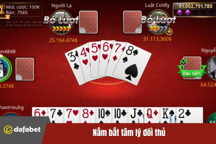 Khi Sâm lốc, kỹ năng đọc vị đối thủ là một yếu tố quan trọng. Bet thủ hãy chú ý đến cách đối thủ đánh bài, sự do dự hay quyết đoán của họ, đều dự đoán được những lá bài mà họ đang nắm. Chiến hữu cũng nên quan sát kỹ lưỡng cách đối phương xử lý các quân bài lớn, các combo mạnh có thể giúp bạn cược đưa ra quyết định chính xác khi chặn bài hoặc đánh đòn phản công.Nắm bắt tâm lý đối thủ giúp bạn chuẩn bị cho các nước đi sắp tới, tránh rơi vào thế bị động. Bằng cách này, bạn có thể tính toán được các nước đi tiếp theo, điều chỉnh chiến thuật linh hoạt để giành lợi thế. Chú ý đến thái độ của đối phương cũng sẽ giúp bạn phát hiện những dấu hiệu bất thường, từ đó ra quyết định chính xác và có lợi cho mình.